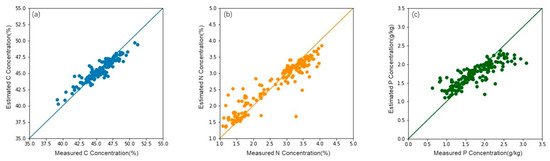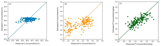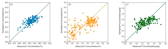Accuracy of estimation model of multiple linear regression for (a) C, (b) N, and (c) P.