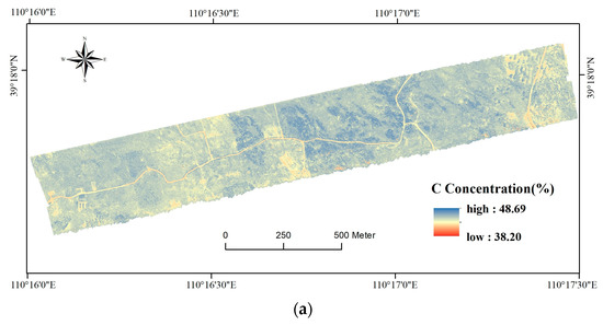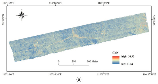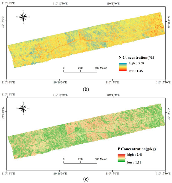 Foliar C, N, and P concentration maps were made to visualize the spatial distribution of these three nutrients. These maps were generated by applying random forest models to the images of the feature variables corresponding to the C, N, and P concentrations. Figure 8a–c illustrates the foliar C, N, and P concentrations in the study area, respectively. The spatial distribution of C, N, and P concentrations in each plant community was significantly different, which could effectively reflect the differences in C, N, and P concentrations among different plant communities.