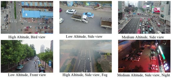 VisDrone is a representative dataset based on a micro-UAV platform, including 263 video clips, 179,264 video frames, and 10,209 still images. Various drone platforms collected these images in 14 different urban scenes in China. In terms of the object-detection task, VisDrone contains 10,209 static images in unconstrained scenes, of which 6471 are used as the training set, 548 are used as the validation set, and 1580 are used as the test-challenge set. Reference [] has already annotated the training set with labels of imaging conditions. Therefore, we used the same settings to conduct experiments and quantitative evaluations on the VisDrone validation set.