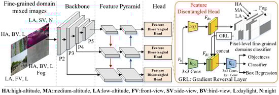 Considering the computational performance constraints of onboard computing devices, we use a single-stage detector as the main network framework and propose two sub-modules named Fine-grained Domain Mix Augmentation and Fine-grained Feature Disentanglement. Using these sub-modules along with the free information recorded by the airborne sensors, we achieve better detection performance than the two-stage fine-grained detector NDFT [] on two typical aerial image datasets, UAVDT and VisDrone. The specific network structure diagram is shown in Figure 3.