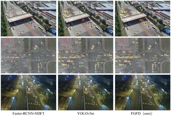 We compared the proposed method with the currently popular fine-grained domain object detectors on the UAVDT [] dataset. The comparison methods include the fine-grained domain-object-detection algorithm NDFT proposed by Wu et al. [], an improved version A-NDFT based on NDFT by Lee et al. [], and a multi-branched fine-grained domain detector proposed by Kiefer et al. []. In addition, Faster RCNN [] and YOLOv5m [] are added to the comparison as two-stage and single-stage baseline models, respectively. Table 8 shows the quantitative evaluation results on the UAVDT dataset, where NDFT+FPN is the combined method of NDFT and FPN [], and it is also the model with the highest AP reported on UAVDT in the literature []. Note that all algorithm implementations used the same Pytorch framework and did not use acceleration techniques such as TensorRT. The experimental results show that the single-stage detector YOLOv5 and our FGFD have significant advantages over the two-stage detector, obtaining higher AP at a lower input image resolution, and the algorithm inference time is much less than the two-stage detector. Furthermore, our proposed FGFD improves AP by 5.7 compared to NDFT+FPN and by 4.2 AP compared to YOLOv5m, and the inference time is comparable to YOLOv5m. It is more conducive to deployment on existing airborne computing platforms. Figure 4 shows some representative examples of visual comparisons.