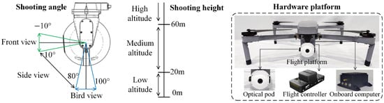 Aerial image target-detection technology can quickly and efficiently extract ground feature information and extend the scene understanding capability of UAVs. It spawns diverse application scenarios [,,,] and is one of the current popular and cutting-edge research directions. The large-scale mobility of the UAV’s airborne imaging equipment brings more changes, and Figure 1 shows the imaging diagram of the optical camera mounted on the UAV platform at different flight heights and different perspectives of the gimbal. These factors and some external conditions, such as weather and illumination, are regarded as imaging condition parameters, which means the aerial image data are divided into many fine-grained domains (see Figure 2). Suppose the detector is directly trained on imbalanced fine-grained domain data; the model will overfit the domain with high frequency, underfit the domain with low frequency, and lack the generalization performance for different fine-grained domains.