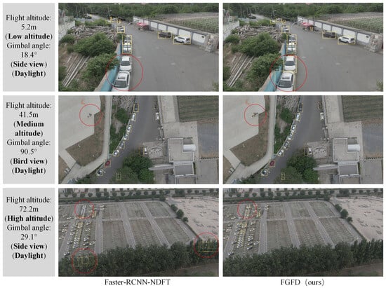 Hanging flight experiment: We further validated the performance of FGFD in real environments by deploying the model learned on the VisDrone training dataset to our flight platform (see Figure 5). The flight platform we use is a self-developed 5 kg class quadrotor drone equipped with the Pixhawk open-source flight controller and an optical pod. The gimbal pitch angle, flight altitude, and time information when taking pictures can be obtained in real time during the flight. To ensure data consistency, we marked images taken below 20 m as low altitude, images taken from 20 m to 60 m as medium altitude, and images taken above 60 m as high altitude. Meanwhile, images taken with a pitch angle of −10° to 10° were marked as front view, images taken with a pitch angle of 10° to 80° were marked as side view, and images taken with a pitch angle of 80° to 100° were marked as bird view. The effectiveness of FGFD is verified by the hanging flying experiment, and some representative results are shown in Figure 6. For example, when the drone is flying at a low altitude, the FGFD can stably detect larger objects, and the false detection rate of small objects is low. In high-altitude flight, FGFD can stably detect dense small objects and greatly reduce the false-detection rate for large objects, see the comparison within the red circle. During the deployment phase, we accelerated the detection network with TensorRT technology and used INT8 quantization for inference. Some speed comparisons are shown in Table 10. On an onboard computer with Nvidia Jetson Xavier NX, the proposed algorithm can process images with 720P (1280 × 720) resolution at a rate of 20 (±2) Hz.