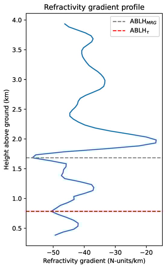 Refractivity tends to decrease with height, revealing a strong negative gradient at the top of the ABL, which is associated with a significant reduction in temperature and moisture [,]. For that reason, ABLH is traditionally identified as the height where the absolute minimum refractivity gradient (MRG) is found []. However, Santosh [] emphasized that processes in the ABL do not demand the refractivity gradient to exhibit its absolute minimum at the top but rather a significant minimum since other factors can produce substantial changes in the refractivity profile. In the lower troposphere, refractivity is highly sensitive to changes in water vapor content, rather than changes in temperature []. Thus, the presence of clouds or moisture advection can cause negative peaks in the refractivity gradient profile whose strength can be similar, or even greater, than that at the ABL top, which leads to ambiguous attribution when identifying the ABLH. This problem is well known [,,].