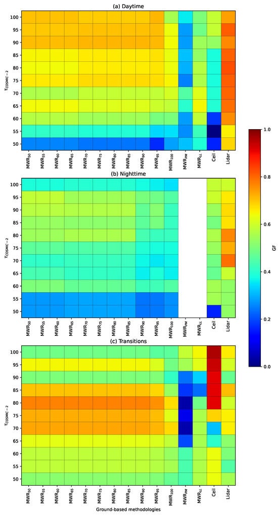 Figure 3 displays the GF values resulting from comparisons with data collected by means of the MWRs, the ceilometer, and the lidar installed in Granada and Évora, respectively, for each period considered throughout the day. Data from these stations are used to find the best value over continents. For daytime, best agreements are achieved when comparing with lidar data, with GF maximum when equals 82% (GF = 0.828). For nighttime, the optimal is also obtained through lidar data, and drops to 68% (GF = 0.813). Finally, for transitions between day and night, and vice versa, the optimal value of is 98% (GF = 0.956), which is validated by ceilometer data. This value is almost the same as the traditional method, which equates to using 100%.