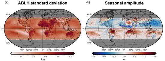 Quantification of the ABLH variability. (a) Standard deviation considering the whole period. (b) Seasonal amplitude: difference between the mean ABLH field in JJA and DJF. Locations in latitudes beyond ° are out of the COSMIC-2 spatial domain.