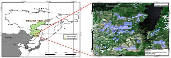 The study area is located in Khabarovsk Municipal District in the south of the Middle Amur Lowland. This region is on the right bank of the Amur River east of Khabarovsk between 48.31° and 48.64°N latitude and 134.81° and 135.57°E longitude (Figure 1). These lands lie in the temperate belt and experience a monsoon type of climate, i.e., winters are quite cold while summers are warm and sometimes hot, with high precipitation. The average annual precipitation is about 700 mm. The duration of the frost-free period is 130–150 days. The short duration of the vegetation season does not allow for the growth of winter crops.