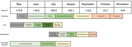 The fallow land represents unused cropland with grass, shrubs, and woody vegetation. The insufficient melioration of cropland is an urgent problem in the Far East, resulting in waterlogging. Vegetation on fallow land experiences growth from the beginning of spring, maintains a consistently high level during the summer, and starts to wilt with a gradual decrease in biomass during the fall. Crop phenology for soybean, oat, buckwheat, and perennial grasses (with average temperatures) is presented in Figure 2.