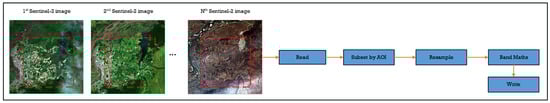 Multispectral Sentinel-2 data (Level-2A product) were accessed from the Copernicus Open Access Hub service. The Graph Processing Framework (GPF), available on the European Space Agency (ESA) Sentinel Application Platform (SNAP) v.9.0 (http://step.esa.int/main, accessed on 21 December 2023; ESA, Paris, France), was used to create graphs and set up chains for batch processing, as shown in Figure 3.