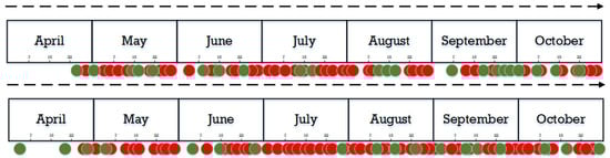 Selected Sentinel-2 scenes (marked in green) for the 2021 and 2022 seasons for the study area. The green color marked scenes with no more than 20% cloudiness and the red color marked scenes with over 20% cloudiness.