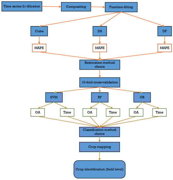 The following supporting information can be downloaded at: https://www.mdpi.com/article/10.3390/rs16091633/s1, Figure S1: SVM accuracy with C values; Figure S2: RF accuracy with the number of trees; Figure S3: GB accuracy with the number of iterations; Figure S4: Crop map of research. Table S1: 10-fold cross-validation OA, % for different algorithms; Table S2: MAPE for different number of terms, crops, and seasons for Fourier fitting.