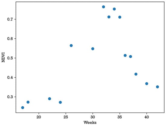 The composites reduced the sparsity in the dataset, this was observed only for weeks with images. The dataset remained highly sparse, missing 36% of the values for 2021 and 47% of the values for 2022. An example of a time series with a large number of missing observations is shown in Figure 6.