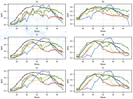 Restored NDVI composite time series: (a) Cube fitted in 2021, (b) Cube fitted in 2022, (c) DF fitted in 2021, (d) DF fitted in 2022, (e) DS fitted in 2021, (f) DS fitted in 2022. The points corresponding to the weeks when satellite observations were made are marked on the graphs.
