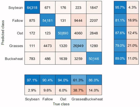 Figure 9 shows the RF confusion matrix. The OA for the RF method was 87.2%, which was 19.9% higher than that of the SVM classifier. The values of F1 for soybean and oat exceeded 0.9 ( = 0.96, = 0.91). The F1 values for buckwheat and fallow exceeded 0.85 ( = 0.87, = 0.85). The most difficult task for the RF classifier was the recognition of the perennial grasses’ series ( = 0.69): 21% of grasses time series were recognized as fallow. It could be related to the lack of plowing during the season in several fields with perennial grasses, making the time series resemble that of abandoned cropland. Nevertheless, the classification results with the RF method could be considered successful.