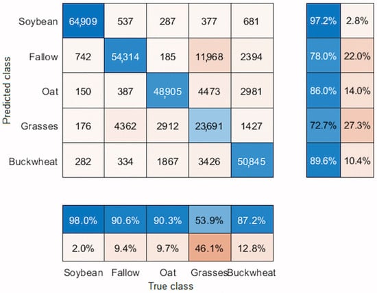 The GB classifier showed high accuracy (OA = 85.9%). The GB confusion matrix is presented in Figure 10. In general, the results were similar to the results obtained from the RF classifier ( = 0.98, = 0.88, = 0.62, = 0.84, = 0.88). Moreover, similar to the other classifiers, the issue of grasses recognition (perennial or natural in unused cropland) is relevant ( and = 0.73).