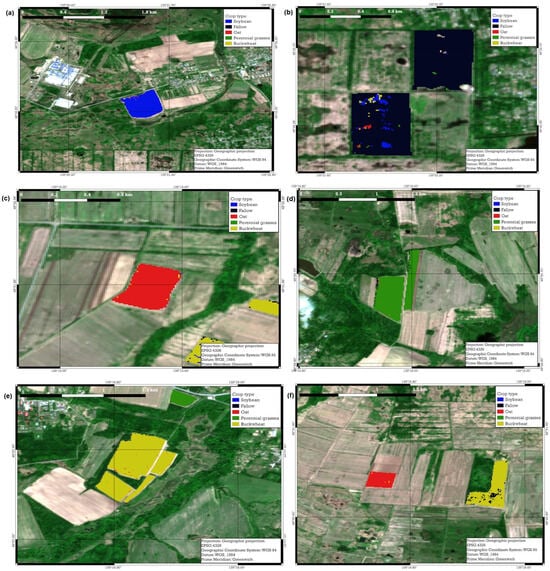 Figure 11 shows the results of crop mapping on individual sites. A correctly classified soybean site is presented in Figure 11a, with 2680 of 2713 pixels (98.8%) identified correctly. Figure 11b shows an example of unused land recognition. Fallow on the up-right site was recognized nearly perfectly, with only 9 out of 2239 pixels being recognized incorrectly. On the left-down site, 5% of time series were classified as soybean; however, the OA for this site was 93.1%. The site with oat in Figure 11c was identified correctly, with only 8 of 1102 series being classified incorrectly. The classification accuracy for both sites with perennial grasses in Figure 11d was higher than 97%; however, a limited number of the series were classified as fallow, which could be attributed to the presence of unused land at the site margins. Figure 11e shows an example of buckwheat cluster mapping. Four sites were identified with an accuracy higher than 96%. The case of misclassification is shown in Figure 11f (marked yellow). This error can be explained by the unsuccessful experience of growing buckwheat on individual sites—buckwheat did not grow, the site was overgrown with weeds, and on visual inspection, it was identified as unused. The resulting combined cropland map is shown in Figure S4.