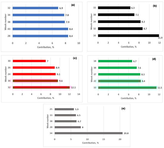 Shapley values analysis [46,47] was performed to explain the contribution of each week to the GB prediction. Figure 12 shows the percentage contribution to the final prediction for each class (the five most valuable weeks were demonstrated in diagrams). All components of the time series are almost uniformly used for soybean series identification: among the most important parameters for prediction are NDVI values at the beginning of the soybean growing season, at its peak, and at the end of the growing season. For the identification of fallow, the most important are NDVI values in August (32–34 weeks), since only for fallow in this period is there a stability of values (for soybean, there is a peak, for oats and perennial grasses, the NDVI in this period is low, and for buckwheat in general, the NDVI growth is characteristic). For oat identification, the NDVI drop after its harvesting at the end of July–August (30, 32, 34 weeks) and the values on the approach to the vegetation peak (24, 26 week) are of the greatest importance. For the recognition of perennial grasses, both the values at the beginning of the growing season (18, 22 weeks) and the values at the time of reaching the second peak (August–September) characteristic of this particular class are important. Due to the early sowing and harvesting of buckwheat in 2022, the most characteristic for buckwheat was the NDVI at week 34 (end of August)—its contribution was 20.8%. It was during this period that buckwheat in 2022 was characterized by a sharp drop in the NDVI. The analysis showed that although summer NDVI values have a greater impact in general, it is important to use the entire seasonal NDVI time series for multiclass classification.