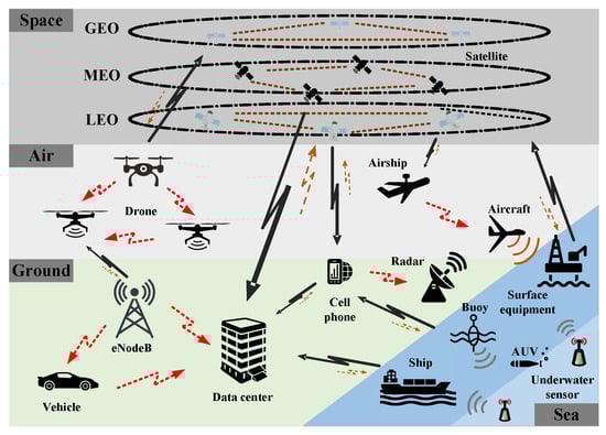 In an SAGSIN, the participant can come from different networks. The framework of an SAGSIN is shown in Figure 1. From this figure, it is evident that the satellite network, aerial network, terrestrial network, and marine network have an inseparable relationship. In general, satellite networks contain a variety of satellites at different altitudes, e.g., geostationary orbit (GEO) satellites, medium-earth orbit (MEO) satellites, and low-earth orbit (LEO) satellites. Aerial networks usually contain aircraft, unmanned aerial vehicles (UAVs), airships, even balloons and they can provide flexible and fast communications for emergency conditions. Moreover, because of these features, aerial networks can serve as a bridge among satellite networks, terrestrial networks, and marine networks. As for terrestrial networks, they always contain cellular networks, vehicle networks, ad hoc networks, local area networks (LANs), and so on. Last but not least, sea networks are made up of marine networks and underwater networks. On the one hand, marine networks provide communication services for ships, buoys, and surface equipment, e.g., floating oil platforms and offshore wind power platforms. On the other hand, underwater networks employ acoustic, optical, and radio data to achieve underwater observations and information gathering. Furthermore, due to the harsh environment and expensive cost of wired communications, it is a very common phenomenon that underwater networks take advantage of autonomous underwater vehicles (AUV), remotely operated vehicles (ROV), and unmanned underwater vehicles (UUV) to form a self-organizing network.