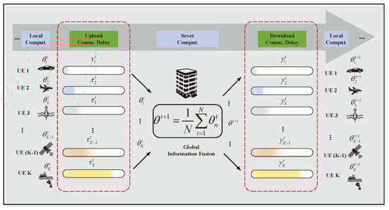 Obviously, the terrestrial network is the core of SAGSINs, which is extended to space, air, and sea areas step by step. An SAGSIN provides multiple network services which guarantee normal activities for all participants. Each individual network of an SAGSIN has its merits and demerits from different aspects, e.g., bandwidth, coverage, and communication quality; therefore, joint information transmission networks are urgently needed. Meanwhile, it makes an SAGSIN become a heterogeneity network with large-scale, three-dimensional, and multi-layer characteristics. The heterogeneous nature creates a lot of difficulties for FL communication procedures, such as spectrum management, network control, power management, and routing management. In particular, in an FL-based SAGSIN scenario, there are multiple propagation conditions in its wireless transmission process, such as air-to-ground, ground-to-air, and sea-to-ground conditions. Since participants come from different networks with various communication distances, the communication latency of each participant is different. For example, when devices in different networks are assumed to upload their parameters for data fusion to a computational center, the latency is not only affected by computation time but is also influenced by communication time. Specifically, for an underwater device and satellite facility, the large latency is caused by the long propagation time or lower propagation speed in special areas. The long time delay of the communication round should not be neglected. Moreover, asynchronous FL is another high-efficiency way to cope with different communication latency values, which require an appropriate asynchronous scheduling policy.
