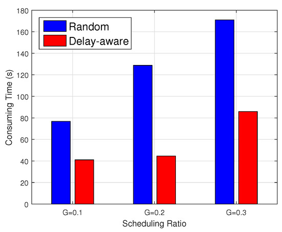 We assumed that the terminal device had high performance and the computation capacity of each participant was the same. Note that the parameter of the training model could be transmitted in one communication round because the parameter could be compressed, and the communication bandwidth was sufficient. The communication parameters of the SAGSIN are shown in Table 1 and include the theoretical communication distance, propagation speed, and the corresponding communication time delay of different SAGSIN devices. In the simulation, 100 participants were employed which contained space devices, aerial devices, terrestrial devices, and oceanic devices. The communication delay was randomly set according to Table 1 with a dynamic delay with a fluctuation. The devices were divided into groups where the latency was sorted from small to large. The time consumption comparisons between random scheduling-based aggregation and delay-aware-based aggregation with scheduling ratios , , and are shown in Figure 3. From this figure, we can see that the delay-aware strategy had a lower time consumption than the random mechanism. In particular, the more available uplink channels the system had, the more obvious the obtained effects. Therefore, by fine grouping according to the delay, the total time consumption of the aggregation was sharply reduced. Therefore, the delay-aware FL is a time-efficient approach for SAGSINs.