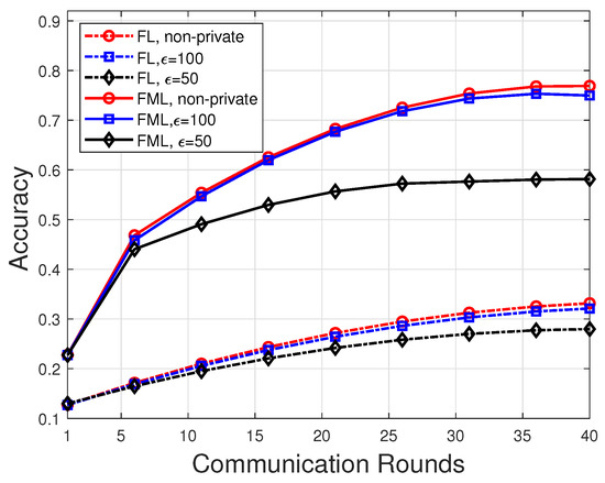 The proposed NbFML and classical noise-based FL (NbFL) convergence performance values are compared in Figure 5, where models were trained on MNIST and validated on MNIST-m. In the simulation, the protection levels were set to and , and each user had 800 training samples. The global communication round was , and the local epoch was . From Figure 5, we find that with the increase in protection level , the accuracy of both NbFL and NbFML decreased. This is because the increased protection level caused more noise to be added to the parameters. The stricter the privacy protection level, the lower the accuracy of user model training. That is to say, the system should trade off accuracy and privacy protection level of users to achieve a desired state according to the actual situation. Moreover, we see that the proposed NbFML had excellent performance, while the classical NbFL accuracy decreased since it had no ability to do transfer learning. The proposed NbFML utilizes the meta-learning method, which is able to tune the network to the labeled data in the target dataset. Hence, the NbFML can transfer its parameters from the source dataset to the target dataset fast. NbFML has a wide application, especially in FL-based SAGSINs with the demand of real-time decision systems.