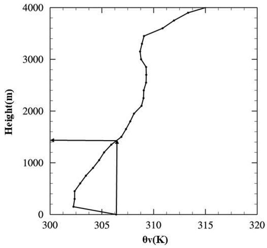 The relative maximum value of the virtual potential temperature on the ground, rises vertically until the height of is detected again, and we define this height as the ABLH and this method is referred to as the air-block method [26], as shown in Figure 2. When the ABL is a convective boundary layer (CBL) structure, the gas block method is used to determine the ABLH [9,23,24,25,27].