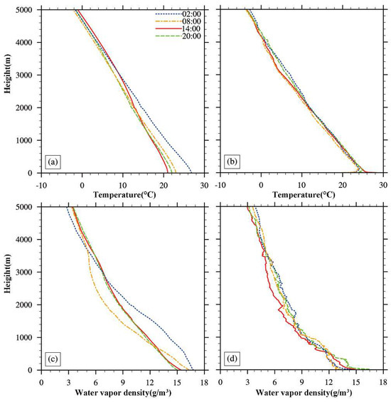 Figure 3 shows the comparison of average temperature and vertical distribution characteristics of water vapor density between the microwave radiometer and observation data at Sieshan station. It can be seen from the figure that the temperature changes regularly at four times, and the difference between the two data is not obvious. However, it can be seen from Figure 3a that the temperature at 02:00 at the lower level is significantly higher than that at the other three times. However, there is no significant difference between the four times in Figure 3b, and compared with the microwave radiometer data (Figure 3a), there is an obvious temperature inversion in the lower layer. As for the water vapor density, there is a large difference between the four times of the microwave radiometer data. It can be seen from Figure 3c that the water vapor density is the highest at 02:00 below 2800 m and the lowest at 08:00 within 1000–3600 m. Different from Figure 3c, there is no significant difference in the variation of water vapor density at the four times in Figure 3d, but the water vapor density at 14:00 within 1000 m to 3600 m is slightly lower than the other three times.