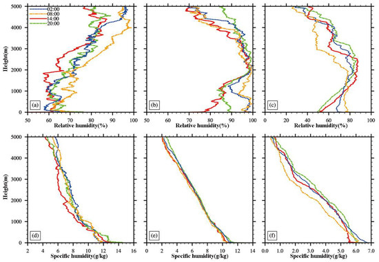The vertical structure of the thermal and dynamic properties of the ABL has a significant effect on the transport and distribution of material within it [30], and the distribution of water vapor in the vertical direction is then influenced by the turbulent action within the ABL. Figure 4 shows the characteristics of the vertical distribution of relative humidity and specific humidity at the three stations, from which it can be seen that the vertical variation of relative humidity at Sieshan station below 5000 m increases gradually with height, while the relative humidity at SETORS decreases and then increases and then decreases with height, and the relative humidity at Qumalai station increases and then decreases with height (Figure 4a–c). The relative humidity at 1400–3000 m is smaller than at other times, while the relative humidity at 08:00 is larger than at other times at every level of height, indicating that the ABL is richer in water vapor at 08:00 in Sieshan station (Figure 4a). The vertical variation of relative humidity at 14:00 in SETORS is different from the other moments, with the surface relative humidity smaller than the other moments then gradually increasing and then decreasing. The relative humidity first decreases slightly from the surface and then increases at the other three moments. The relative humidity at SETORS reaches a maximum of around 2000 m, close to 100%, and then gradually decreases (Figure 4b). The relative humidity at Qumalai station also reached a maximum around 2000 m, close to 90%. The relative humidity at the Qumalai station did not change significantly below 2000 m at 08:00, and the surface relative humidity at 14:00 and 20:00 was the smallest among the three stations (Figure 4c).