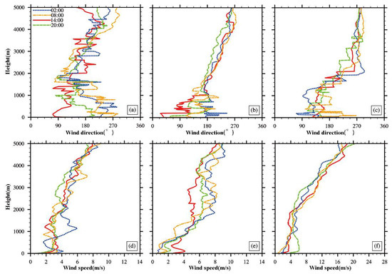 Among the three stations, the wind speed at Qumalai station varied greatly with height, with a maximum wind speed of 20 m/s (Figure 5f). The wind speed varied less with height at Sieshan station, and the maximum wind speed could reach 9 m/s (Figure 5d). There was a sharp decrease in wind speed at 100 m at 02:00, and then, the wind speed started to increase sharply at 500 m and started to decrease at 1200 m (Figure 5d). At SETORS, except for 02:00, there was a sharp decrease in wind speed at 100 m, and then the wind speed increased sharply at 400 m, and the wind speed increased slowly with height above 1600 m at 14:00 (Figure 5e). At 20:00, the ground wind speed at Qumalai station reached a maximum of 4 m/s, and the wind speed began to increase sharply above 3000 m. At 02:00, 08:00, and 14:00, the wind speed increased sharply to around 2000 m, and the maximum wind speed was 20 m/s, which is the largest among the three stations (Figure 5f).