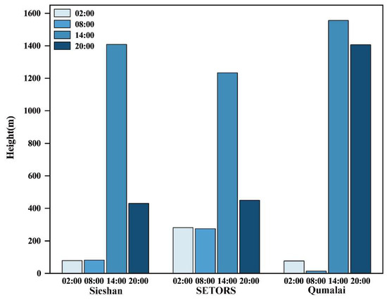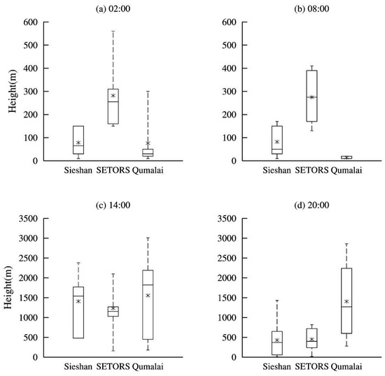 Figure 8 shows the box plot of ABLH at each station for four time periods. It can be seen from the figure that the ABLH of the three stations varies greatly at different times. At 02:00 (Figure 8a), the ABLH is the highest compared with the other two stations at SETORS, mainly around 150–400 m. The ABLH is below 200 m at Sieshan station, while that is mainly below 100 m at Qumalai station. At 08:00 (Figure 8b), the ABLH at each station is similar to that at 02:00, with the ABLH at Qumalai station becoming significantly lower compared to that at 02:00, while the ABLH at SETORS is mostly slightly higher than that at 02:00. At 14:00 (Figure 8c), the ABLH is mainly below 2000 m at Sieshan station, and the ABLH is mainly around 1000–1500 m at SETORS, while ABLH is mainly below 2500 m at Qumalai station, and the ABLH varied within 500–2300 m, with a large range of variation. Except the ABLH slightly decreases at Qumalai station, the ABLH decreases significantly at the other two stations, and the ABLH mostly decreases to below 1000 m at these two stations. Compared with the ABLH at 20:00 and 02:00, the ABLH decreases sharply at Qumalai station, which indicates that the convective activity is strong during the day and weak at night at Qumalai station. The daily variation of ABLH is the smallest at SETORS.