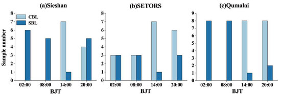 Diurnal variation of sample numbers of CBL and SBL at three stations (The 3 subfigures of a–c share a common legend).