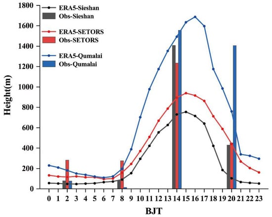 Figure 9 shows the hourly variation of mean ABLH between the ERA5 reanalysis data and the observed data in June, from which it can be seen that the hourly variation of ABLH at the three stations is basically the same. The ABLH is lower in the morning and evening and reaches the highest at 15:00, among which the ABLH is the highest at Qumalai station, followed by the SETORS and finally the Sieshan station. At 02:00, the ABLH of ERA5 reanalysis data is smaller than that of observed data at SETORS and Sieshan station, while the opposite is true at Qumalai station. At 08:00, the ABLH of ERA5 reanalysis data is still smaller than that of the observed data at SETORS, while the ABLH of ERA5 reanalysis data is larger than that of the observed data at Qumalai station. At 14:00, the ERA5 reanalysis data of both SETORS and the Sieshan station show significant overestimation of the observed data, while at 20:00, the Sieshan and Qumalai stations show significant underestimation. In summary, the ABLH of ERA5 reanalysis data is smaller than that of the observed data in the morning and evening at Sieshan station and SETORS, and the opposite is true at noon. The ABLH of ERA5 reanalysis data is larger than that of the observed data in the morning and evening, and the difference between them is not obvious at noon in Qumalai station.