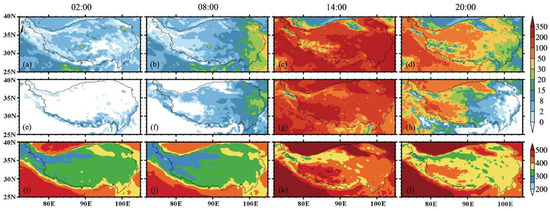 Figure 10 shows the spatial distribution characteristics of the surface heating field (LE and H), Rlu, and w in four time periods on the TP. In summer, the surface heating field of the plateau is dominated by LE. From 02:00 to 14:00, the heating of the surface by solar radiation gradually increases, and the LE and H increase. The LE and H are always larger in the eastern plateau than in the western plateau due to different underlying surfaces and altitudes (Figure 10a–c,e–g). At 20:00, the intensity of the surface heating field gradually decreases, and the LE and H in the western plateau are larger than those in the eastern plateau (Figure 10d,h), which indicates that during the period of gradual heating of the surface by solar radiation, the eastern plateau absorbs energy faster and exchanges energy faster, and the intensity of surface heating field rapidly decreases when there is no solar radiation heating. At 02:00 and 08:00, the Rlu value in the western plateau is smaller than that in the eastern plateau (Figure 10i,j), and the Rlu value reaches its maximum at 14:00, and there are large value areas of Rlu in the eastern and southwestern plateau, and Rlu value can reach more than 400 W/m2 in the eastern part. At 20:00, the Rlu decreases and is mainly above 350 W/m2 in the eastern plateau.