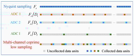 The multi-channel coprime low-sampling scheme is shown in Figure 3. There are coprime multiple channels, and each channel has a fixed sampling frequency. The sampling intervals among channels are uniform and coprime. The sampling rates of each channel ADC are , where is the Nyquist sampling rate of the laser radar, and are all coprime. The sum of the sampling rates of multi-channel coprime low-sampling is less than . is the time-domain echo of the dechirp-received signal that can be collected by the channel, where . is the number of sampling points of laser radar under ideal Nyquist sampling.