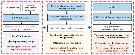 High-resolution ranging based on optimal multi-channel coprime low-sampling under low SNR is proposed in this section, and some key procedures are discussed in detail. According to the ranging model in Section 2, the challenges of selecting the optimal multi-channel coprime low-sampling combination and mitigating asynchronous sampling-time error and noise interference are crucial for accurately estimating the target range with a small sample number. To address these issues, in this manuscript, we propose the novel processing framework shown in Figure 4.