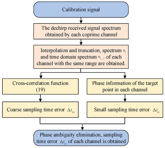 where is the spectrum obtained by interpolating and truncating the dechirp-received signal spectrum of each channel when there is no sampling-time error. The small sampling-time error estimation results in the range of can be estimated from the phase angle . Using the small sampling-time error , combined with the coarse sampling-time error of phase ambiguity eliminating, we can obtain the precise sampling-time error corresponding to the i-th coprime channel and the reference channel.