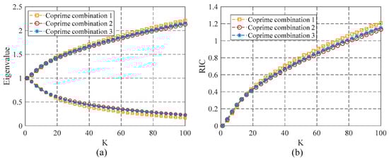 where is the scalar product, and denotes conjugate transpose. If satisfies the RIP, then the eigenvalues of belong to . The smaller is, the closer the eigenvalue of is to 1, which means that is closer to the unit matrix. This shows that the column vectors of are approximately orthogonal to each other, and the equation group (12) composed of the laser-radar ranging model based on a multi-channel coprime low-sampling scheme is independent. A more accurate target-range estimation result is obtained by solving this equation group.