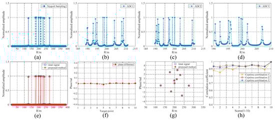 Performance comparison of optimal coprime combinations. (a) Range profile of Nyquist sampling. (b) Range profile of ADC1. (c) Range profile of ADC2. (d) Range profile of ADC3. (e) Range profile of the proposed method. (f) Target phase difference. (g) Two-dimensional figure of target range phase. (h) CORR under 10 scenes.