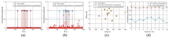 Comparison of the results before and after the sampling-time error compensation. (a) With compensation. (b) Without compensation. (c) Two-dimensional figure of target range phase. (d) CORR under 10 sampling-time error scenarios.