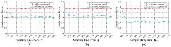Average of the correlation coefficient under different sampling-time error conditions. (a) Correlation coefficient under Channel 2 with sampling-time error of . (b) Correlation coefficient under Channel 3 with sampling-time error of . (c) Correlation coefficient under Channels 2 and 3 in sampling-time error conditions.