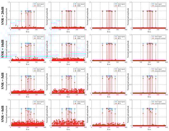 Figure 13 shows different algorithms’ target-range-estimation results when the SNR is 20, 10, 5, and 0 dB, respectively. The target-range information obtained by the FISTA algorithm is shown in the first column in Figure 13. The target-range information obtained by the OMP algorithm is shown in the second column in Figure 13. The target-range information obtained by the BCS algorithm is shown in the third column in Figure 13. The target-range information obtained by the proposed method is shown in the fourth column in Figure 13. When the SNR is 20 dB, the target-range information can be obtained by the four algorithms. With the continuous reduction in the SNR, the target-range estimation results of OMP, FISTA, and BCS algorithms have strong false points. The proposed method can still accurately obtain the target-range information without introducing strong false points.