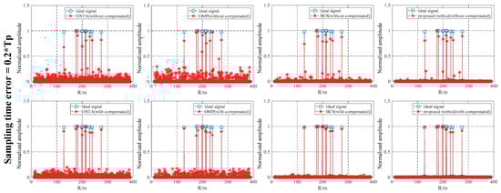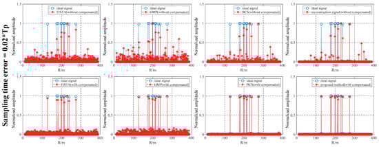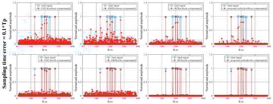 To further evaluate the performance of the proposed method, the performance of the target-range-estimation results under the SNR were compared and analyzed in combination with the sampling-time error. Figure 15, Figure 16 and Figure 17 show the distance-estimation results obtained by different methods under 10 dB SNR when the sampling-time error is , , and , respectively. The target-range information was obtained by different algorithms without sampling-time error compensation and is shown in the first row in Figure 15, Figure 16 and Figure 17. The target-range information obtained by different algorithms with sampling-time error compensation is shown in the second row in Figure 15, Figure 16 and Figure 17. It can be clearly seen that the performance of the different algorithms with sampling-time error compensation was significantly higher than that of the algorithm without error compensation under a 10 dB SNR. The effectiveness of our proposed sampling-time error-compensation method is further illustrated. The distance estimation results of the proposed method were obviously better than those of the other reference methods, showing that it can accurately estimate the target-distance information without introducing false points.