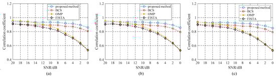 Average of the correlation coefficients of the four methods under different SNRs in multiple scenarios with the sampling-time error compensation. (a) Sampling-time error is . (b) Sampling-time error is . (c) Sampling-time error is .