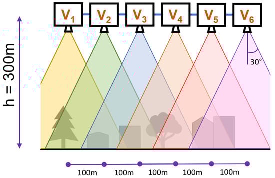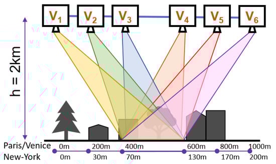 The Dublin dataset acquisition track has a different geometry to the one presented for SyntCities. For the Dublin campaign, images are taking with a single camera along the flight path. Therefore, the images cover different areas with some overlapping between adjacent acquisitions. In the Figure 6 we show a simplified diagram of the camera positions and ground coverage. A distance of approximately 100 m is given between two consecutive images, leading to a forward overlap of ∼.