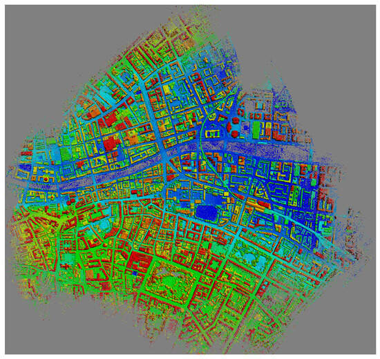The Dublin dataset (The original Dublin dataset can be downloaded at: https://geo.nyu.edu/?f%5Bdct_isPartOf_sm%5D%5B%5D=2015+Dublin+LiDAR, accessed on 20 December 2024) is a collection of data acquired on 2015 over the downtown of Dublin, Ireland. The campaign had a flying altitude of 300 m and retrieved LiDAR data (as point clouds and full waveform), oblique images, geo-referenced RGB and infrared imagery, and the respective acquisition metadata.