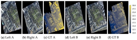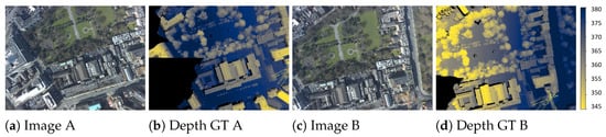 The SyntCities dataset is a synthetic dataset that was developed to compensate for the lack of stereo paired data in the remote sensing field. Since these images are generated directly from the 3D software Blender (v3.1) by using BlenderProc [], the ground truth is accurate and dense, which means we have a reliable reference value for all pixels. The images have been rendered at a ground sample distance (GSD) of 10 cm, 30 cm and 1 m. In the original setting, 4 pairs are given for the same area with different baselines. For the new experiments, we benefit from the fact that despite having different baselines, all tiles with the same naming number (based on the SyntCities file organization) are on the same epipolar line. The SyntCities dataset assumes that the camera follows a flight track over the scene and acquires the images at 25 locations; as those points act as the center for the stereo arrays, we generated the stereo pairs by simply increasing the baselines. Hence, for each location we have 8 images along the epipolar line considering the left and right views (4 baselines × 2 views). The selected testing samples have a GSD of 30 cm and 1 m and belong to the Venice and Paris samples, as height differences are not so large in these cities.