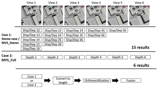 Starting from the stereo cases, which are Stereo and MVS_Stereo, we have a total of 15 possible combinations, and we always consider the disparity map from left to right to get positive values, which is a restriction for the estimation of the networks. The 15 disparity maps are then converted into height using the camera parameters along with the baseline and subsequently georeferenced using the camera positions. Nonetheless, the transformation of the disparity maps to height maps is still influenced by the acquisition perspective, having an oblique view. Hence, it is necessary to orthorectify the images to have the geometry required for the DSM.
