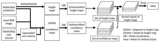 First, disparity/depth maps are converted to height maps using photogrammetric algorithms. For this step, LAFNet is not required, just the results from the Stereo, MVS_Stereo and MVS_Full algorithms. In parallel, the same depth/disparity maps along with the cost volume (which has to be upsampled) and the RGB images are used as input to LAFNet, generating a confidence map as a result.