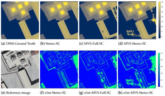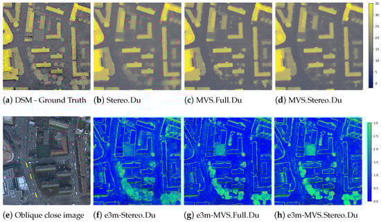 DSMs and error maps for a Dublin sample. For ground truth (a), we show the DSMs computed by using the models Stereo_Du (b), MVS_Full_Du (c) and MVS_Stereo_Du (d). The respective 1 m-error maps (e1m) for the same models are shown in (f–h). Scale bars in meters for the DSMs and error maps are given as a reference. Errors are clipped to a maximum of 3 m. Regions in black correspond to undefined pixels by the algorithms. The corresponding orthorectified RGB is not shown, as this was not provided in the original dataset for this region. Instead, we show an oblique image captured close to this region in (e). This image is not aligned with the results.