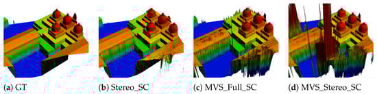 We did not include more architectures for each case, as it is out of the scope of this article to evaluate the performance of multiple stereo and MVS approaches, but to observe the main differences between these two. In addition, these two networks were compared with traditional approaches in our previous work [], which complements the findings from the experiments in this article.